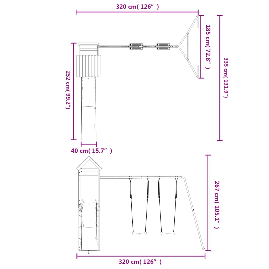 Durable Construction: Crafted from vacuum pressure impregnated pinewood, this playset is built to withstand the elements while maintaining its beauty. The wood is treated for decay resistance, ensuring a long-lasting play area for children. Exciting Features: The playset includes a thrilling wavy slide that adds excitement to playtime, while the double swings provide joy and interaction among friends. Each component has been designed to promote safe, engaging play. Spacious Design: With enough room for four children to play together, this playset is perfect for playdates or family gatherings. Easy Maintenance: Designed for outside use, this playset needs only minimal upkeep. Just wipe it down with a damp cloth and steer clear of harsh cleaners to keep it looking its best. Safety Compliant: Safety is paramount, and the playset comes with crucial guidelines for anchoring to prevent tipping, giving you peace of mind as the kids enjoy their play.- Color: Brown