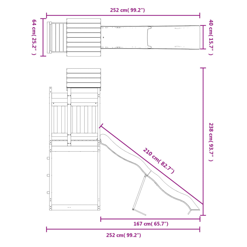 Durable Elements: Made from solid pine wood, built to last for everyday fun without losing safety. Wavy Slide Fun: The unique slide gives a thrilling ride, encouraging kids to zoom down with joy. Extra Stability: Anchors included to secure the set, cutting down on tipping worries while kids play hard. Great for Outdoors: Designed just for outdoor fun, it turns your garden into a lively play area for gatherings and playdates. Spacious Size: At 25.2 in wide, 105.1 in long, and 93.7 in high, it fits up to 3 kids, perfect for group play and shared fun.- Color: Brown