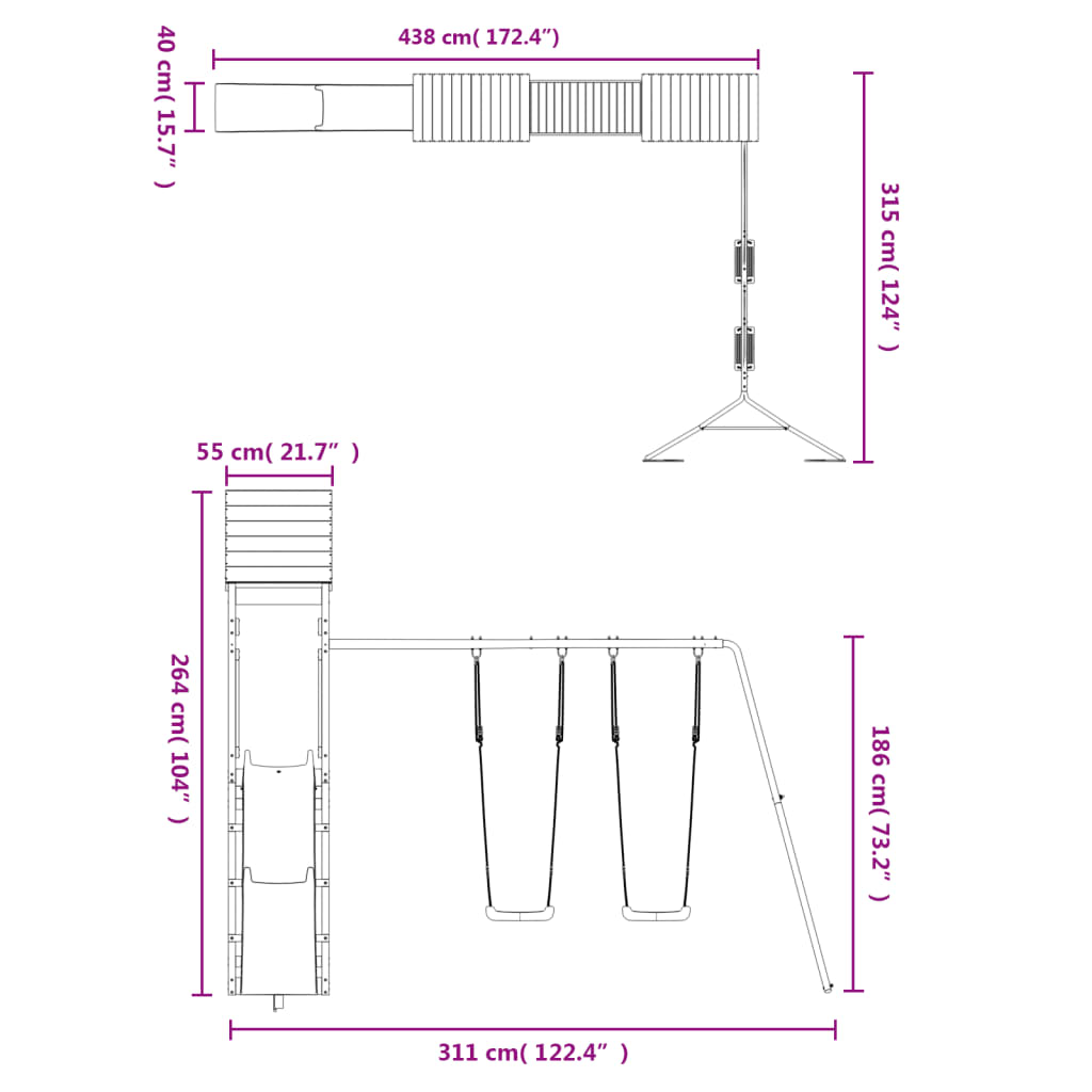 Durable Construction: Made from solid treated pinewood, this playset is built to last and resist weather, keeping outdoor play safe even in summer showers. Versatile Play Options: Featuring a wavy slide and two swings, this set offers plenty to keep kids active and develop their motor skills, all while having fun. Spacious Design: Designed for up to four children, this playset gives kids a place to hang out together, encouraging cooperative playtime. Easy Maintenance: The smooth, weathered finish looks good and is simple to clean, ensuring years of hassle-free fun. Adaptable Use: Perfect for gardens and backyards, this playset brightens up outdoor spaces, creating lively settings for kids to thrive.- Color: Brown