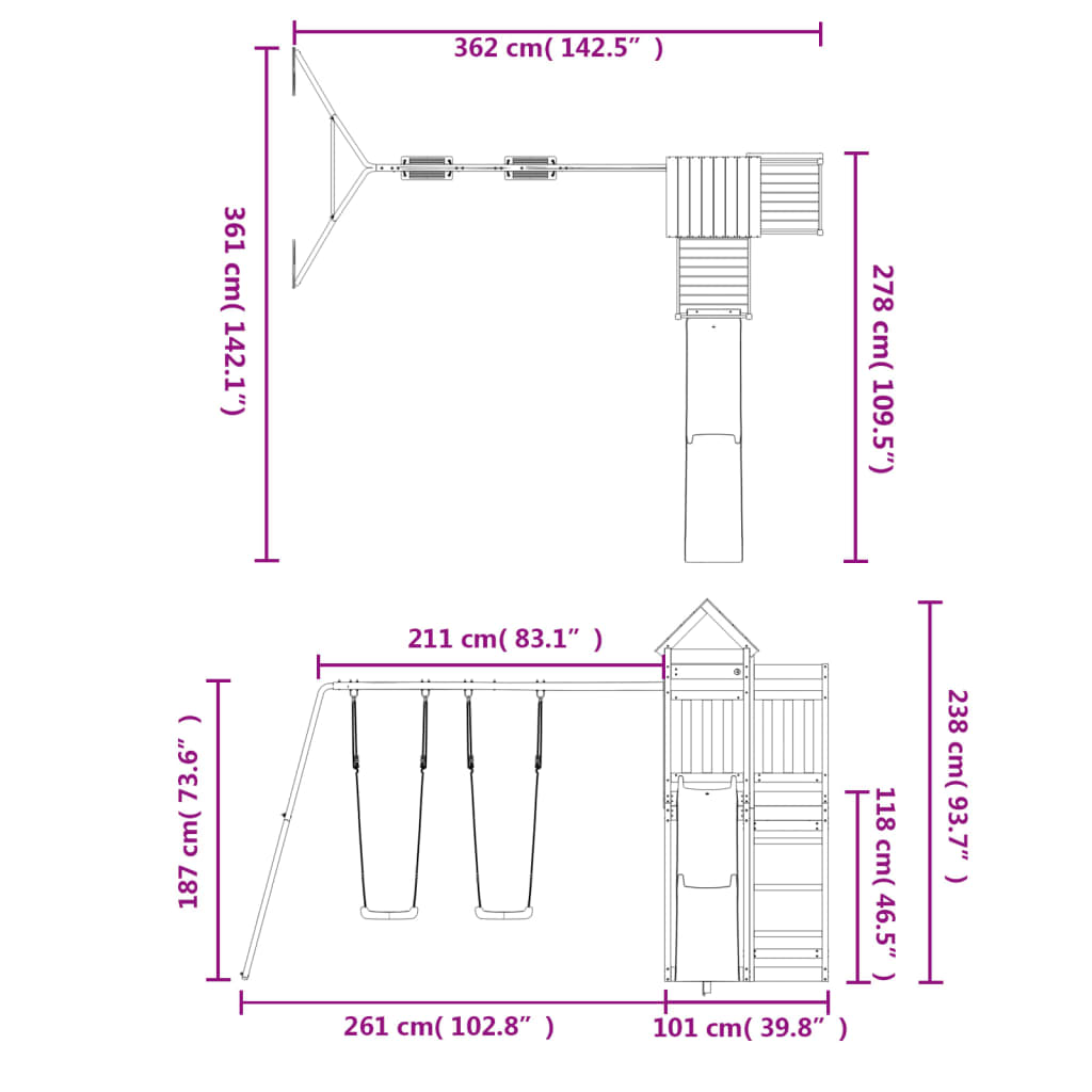 Safety Features: It's designed with safety railings and a shade roof, ensuring a secure space for kids. This focus on safety lets your little ones enjoy their outdoor fun without worry, making it a great addition to your garden. Durable Materials: Built from solid treated pinewood, this playset can take on different weather conditions while staying solid. The UV resistant materials make sure it will last through many fun seasons, giving you great value for your investment. Versatile Setup: With swings, a wavy slide, and a nice play tower, this set can keep multiple kids entertained together. It’s perfect for encouraging social fun and lets kids swing, slide, and climb together, making their playtime even better. Age Range: Tailored for ages 3 to 8, this playground set caters to what young kids need. It promotes physical activity, social skills, and imaginative play, making it an ideal choice for family gardens. Large Dimensions: At 146.9 in wide, 142.5 in long, and 93.7 in high, this playset offers plenty of space for kids to move around while playing. Its size makes it a highlight of your outdoor adventure area.- Color: Brown